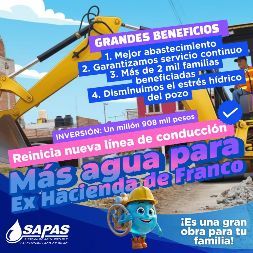 En este 2026, la ciudadanía también verá materializada la creación de la nueva línea de agua potable en el fraccionamiento Ex Hacienda de Franco, ubicado en la zona poniente de la ciudad. En la introducción de la nueva línea de conducción, el SAPAS invertirá un millón 908 mil pesos.