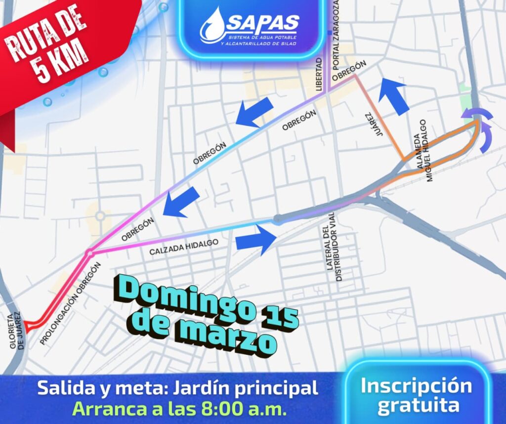 La carrera comenzará a las 8:00 de la mañana del domingo 15 de marzo, partirá del jardín principal y recorrerá una ruta de 5 kilómetros, a través de las avenidas Zaragoza, Libertad y Obregón; el monumento a Juárez; la prolongación Obregón Norte; la Calzada Hidalgo y la alameda Miguel Hidalgo; la calle Juárez; el tramo sur de la avenida Álvaro Obregón y las avenidas Libertad y Zaragoza, volviendo a la plaza principal Victoria.