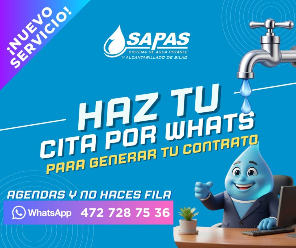 El área de Contratos del Sistema de Agua Potable y Alcantarillado de Silao (SAPAS) ofrece atención vía WhatsApp para agendar cita y no hacer fila a la hora de acudir a solicitar una nueva cuenta.